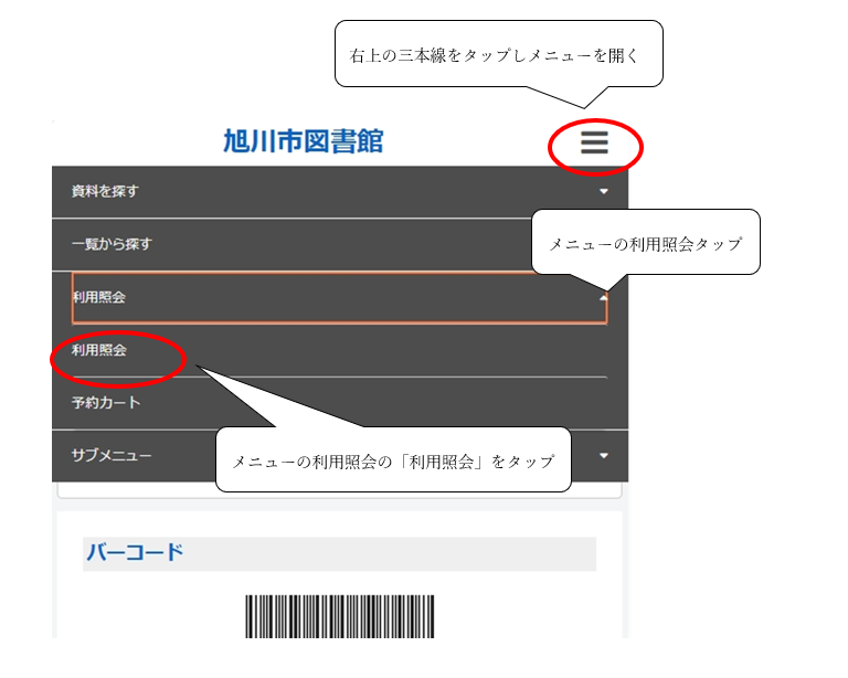 1 インターネット予約システムにログインし、メニューの利用照会の中の「利用照会」を押す。