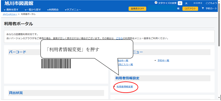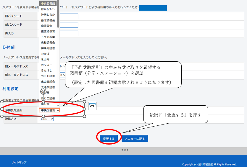 3 画面下の方の「利用設定」の「予約受取場所」で受取を希望する図書館(分室・ステーション)を設定し、最後に「変更する」を押す。